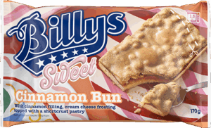 Billys Sweet – Cinnamon Bun: With cinnamon filling, cream cheese frosting, and a shortcrust topping – like a cinnamon bun in pizza style!