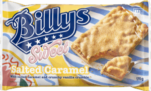 Billys Sweet – Salted Caramel. With salted caramel and vanilla cookie crumbs that create the perfect balance between sweet and salty.