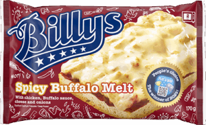 The People's Favorite 2025 – voted by 42,112 unique Billy's eaters! They got to choose the flavor, name, and packaging design – and we created a pizza based on their responses. A pizza with chicken, Buffalo sauce, cheese, and onion.
